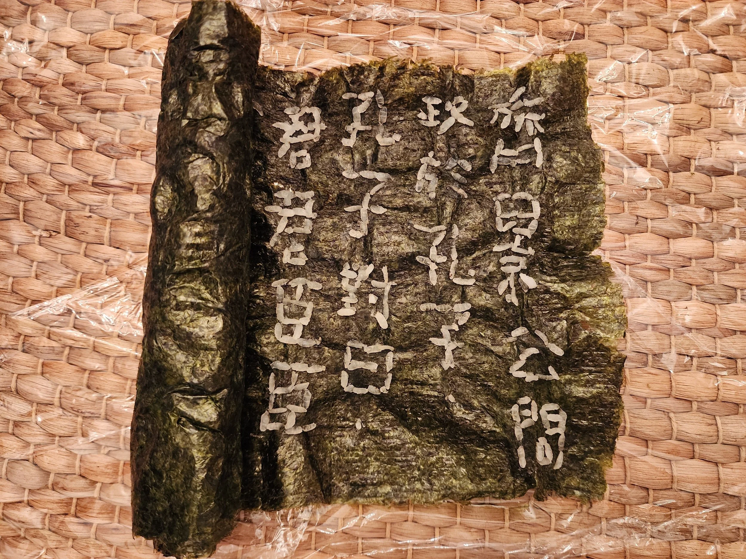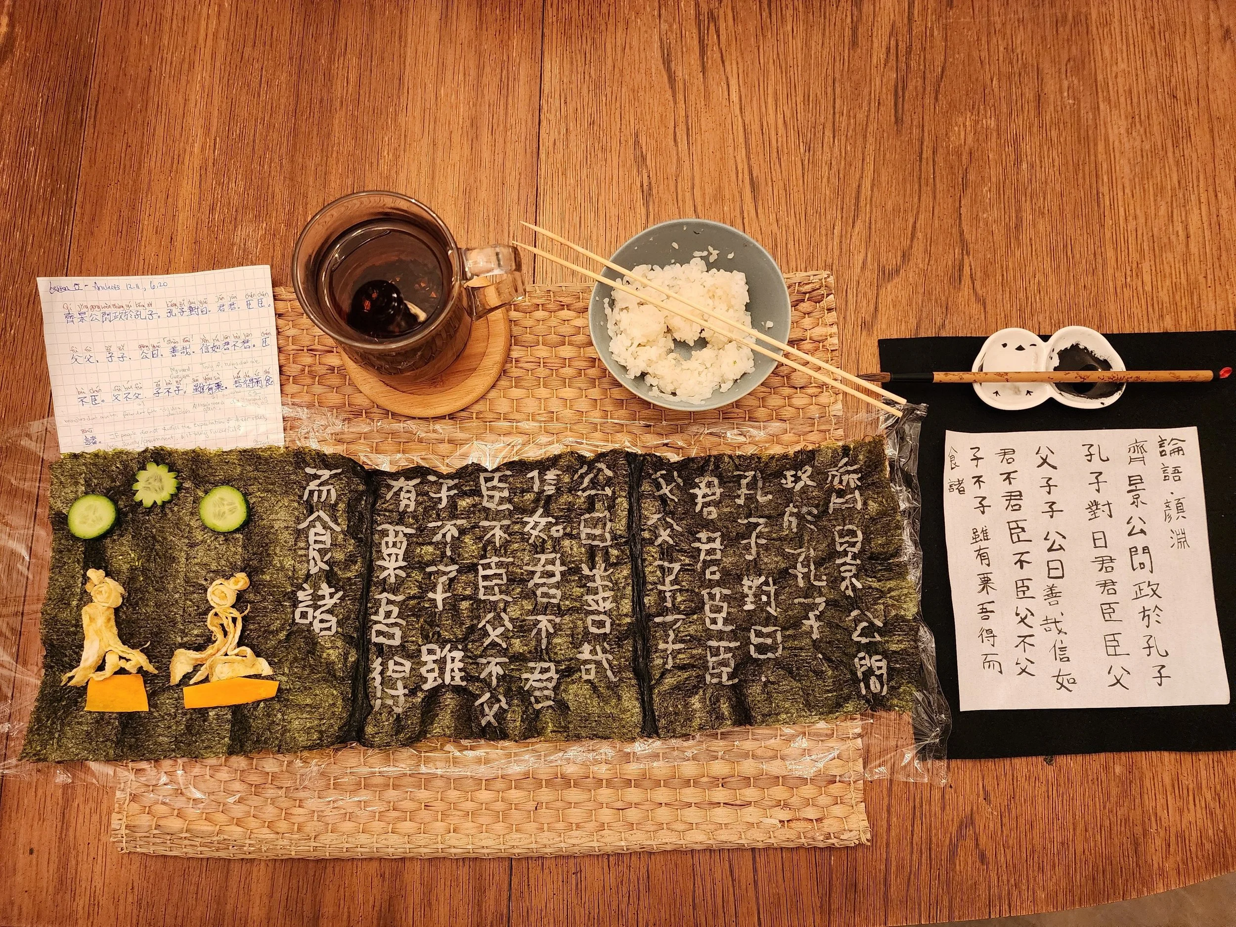 But don’t let me end on a pessimistic note! Instead, the whole intention with this blog is to bring you joy and hope and inspiration by sharing a beautiful thing that happened in my little word: One of my classical Chinese students, Hue Huang, took it upon herself, in an act of pure Confucian dedication to studying and virtuous self-cultivation, to transcribe the above-mentioned passage in a medium called “rice calligraphy.” As she told me herself, it took her five “grueling” hours, after which she consumed (or literally “internalized”) the whole art piece as an evening snack while contemplating the preciousness of grain, impermanence of her work, and changeability of text and context!
